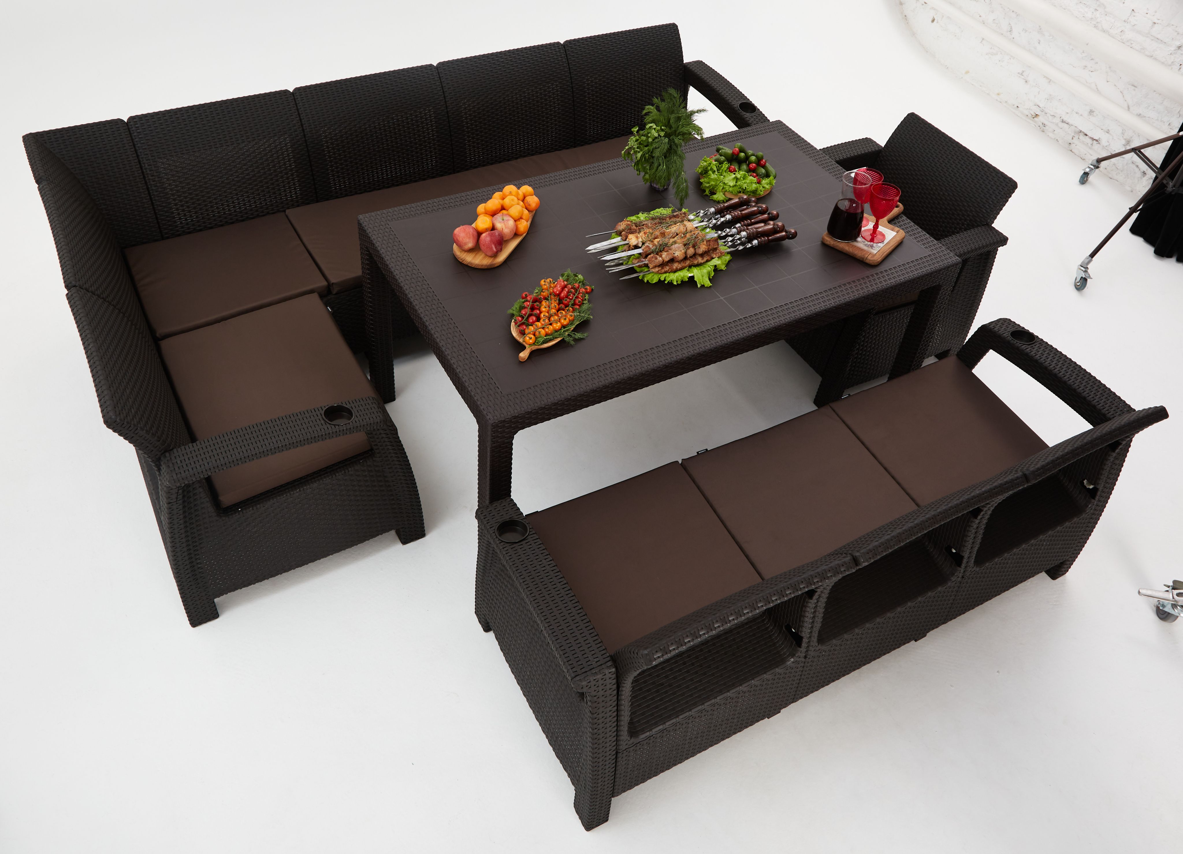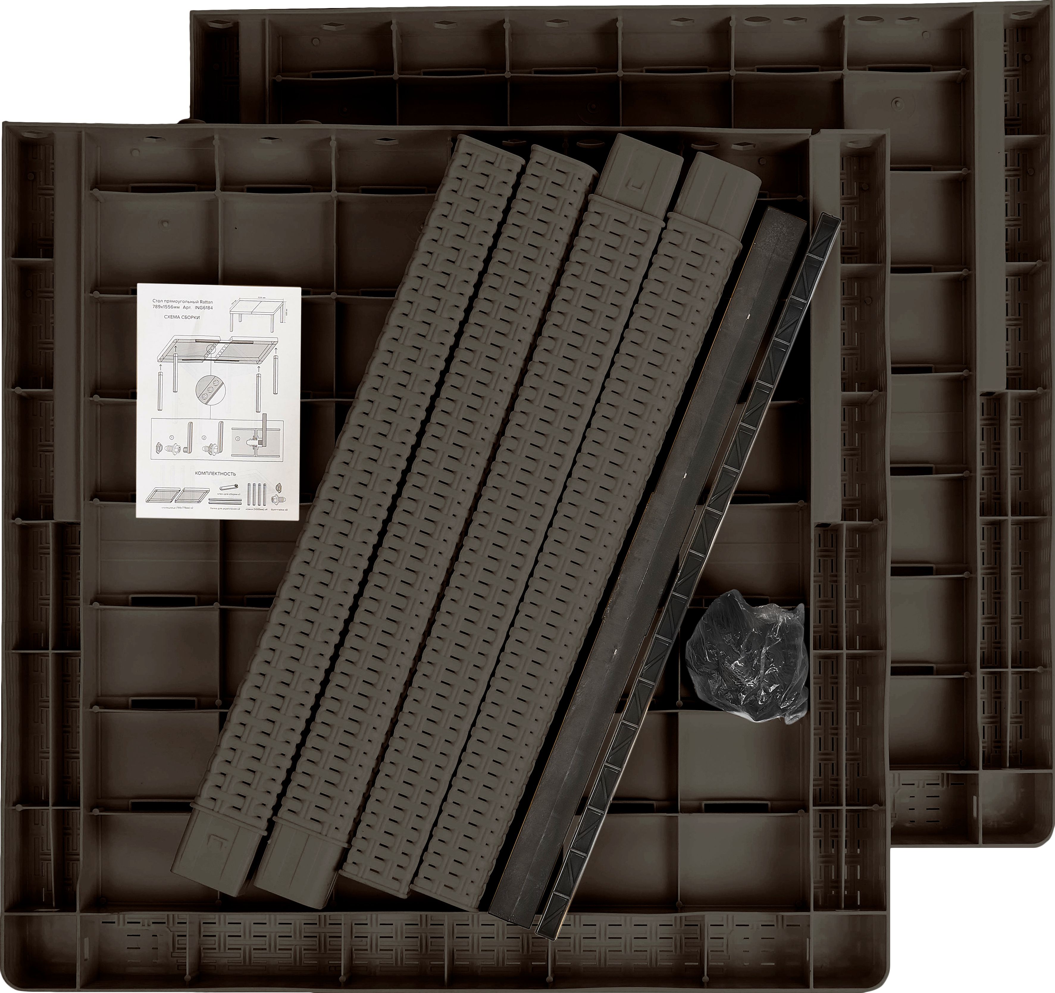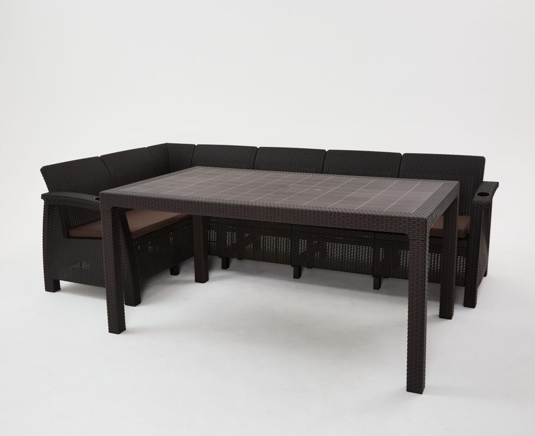 Диван садовый угловой - 1 шт., стол обеденный - 1шт; комплект подушек для углового дивана - 1 шт.; инструкция по сборке. |